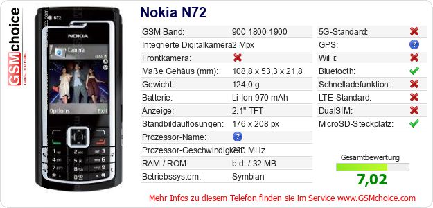 Hast du eigene Webseite? Willst du die Informationen über Standarddaten des Handys Nokia N72 irgendwo veröffentlichen? Das ist sehr einfach. Du kannst das Bild herunterladen oder kopieren und auf der Webseite folgenden Code hinzufügen:Das Einfügen von diesem Code verursacht das Anzeigen von dem folgenden Bild: