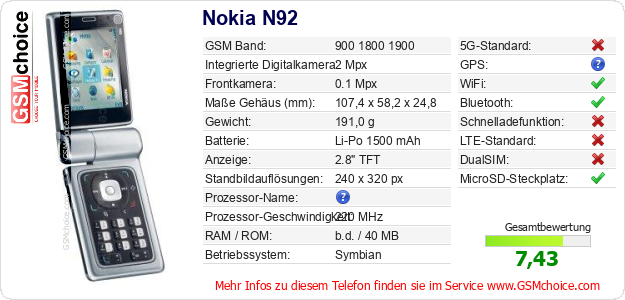 Hast du eigene Webseite? Willst du die Informationen über Standarddaten des Handys Nokia N92 irgendwo veröffentlichen? Das ist sehr einfach. Du kannst das Bild herunterladen oder kopieren und auf der Webseite folgenden Code hinzufügen:Das Einfügen von diesem Code verursacht das Anzeigen von dem folgenden Bild: