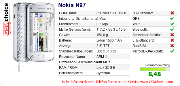 Hast du eigene Webseite? Willst du die Informationen über Standarddaten des Handys Nokia N97 irgendwo veröffentlichen? Das ist sehr einfach. Du kannst das Bild herunterladen oder kopieren und auf der Webseite folgenden Code hinzufügen:Das Einfügen von diesem Code verursacht das Anzeigen von dem folgenden Bild: