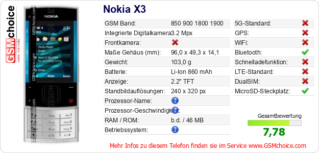 Hast du eigene Webseite? Willst du die Informationen über Standarddaten des Handys Nokia X3 irgendwo veröffentlichen? Das ist sehr einfach. Du kannst das Bild herunterladen oder kopieren und auf der Webseite folgenden Code hinzufügen:Das Einfügen von diesem Code verursacht das Anzeigen von dem folgenden Bild:
