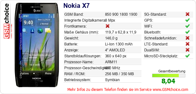 Hast du eigene Webseite? Willst du die Informationen über Standarddaten des Handys Nokia X7 irgendwo veröffentlichen? Das ist sehr einfach. Du kannst das Bild herunterladen oder kopieren und auf der Webseite folgenden Code hinzufügen:Das Einfügen von diesem Code verursacht das Anzeigen von dem folgenden Bild: