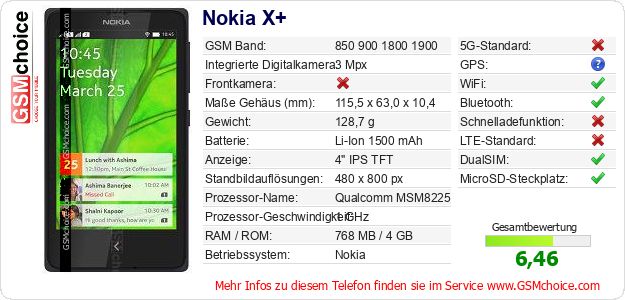 Hast du eigene Webseite? Willst du die Informationen über Standarddaten des Handys Nokia X+ irgendwo veröffentlichen? Das ist sehr einfach. Du kannst das Bild herunterladen oder kopieren und auf der Webseite folgenden Code hinzufügen:Das Einfügen von diesem Code verursacht das Anzeigen von dem folgenden Bild:
