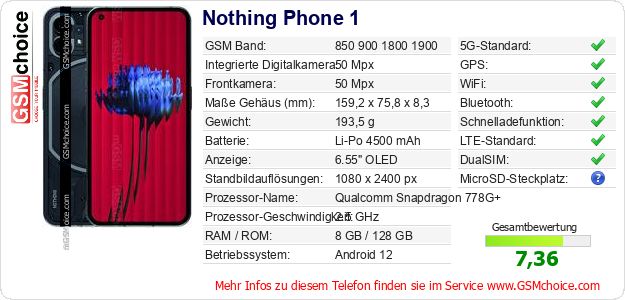 Hast du eigene Webseite? Willst du die Informationen über Standarddaten des Handys Nothing Phone 1 irgendwo veröffentlichen? Das ist sehr einfach. Du kannst das Bild herunterladen oder kopieren und auf der Webseite folgenden Code hinzufügen:Das Einfügen von diesem Code verursacht das Anzeigen von dem folgenden Bild: