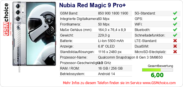 Hast du eigene Webseite? Willst du die Informationen über Standarddaten des Handys Nubia Red Magic 9 Pro+ irgendwo veröffentlichen? Das ist sehr einfach. Du kannst das Bild herunterladen oder kopieren und auf der Webseite folgenden Code hinzufügen:Das Einfügen von diesem Code verursacht das Anzeigen von dem folgenden Bild: