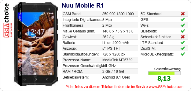 Hast du eigene Webseite? Willst du die Informationen über Standarddaten des Handys Nuu Mobile R1 irgendwo veröffentlichen? Das ist sehr einfach. Du kannst das Bild herunterladen oder kopieren und auf der Webseite folgenden Code hinzufügen:Das Einfügen von diesem Code verursacht das Anzeigen von dem folgenden Bild: