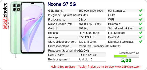 Daten des Mobiltelefons Nzone S7 5G auf Ihrer Seite