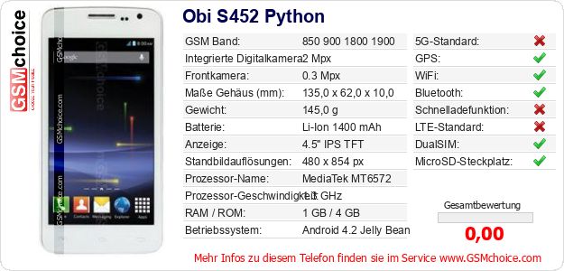 Daten des Mobiltelefons Obi S452 Python auf Ihrer Seite