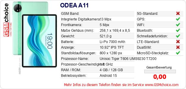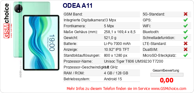 Hast du eigene Webseite? Willst du die Informationen über Standarddaten des Handys ODEA A11 irgendwo veröffentlichen? Das ist sehr einfach. Du kannst das Bild herunterladen oder kopieren und auf der Webseite folgenden Code hinzufügen:Das Einfügen von diesem Code verursacht das Anzeigen von dem folgenden Bild: