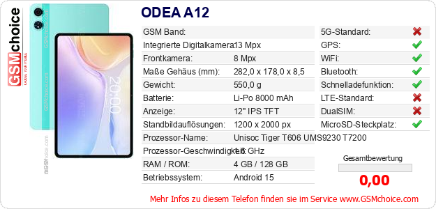 Hast du eigene Webseite? Willst du die Informationen über Standarddaten des Handys ODEA A12 irgendwo veröffentlichen? Das ist sehr einfach. Du kannst das Bild herunterladen oder kopieren und auf der Webseite folgenden Code hinzufügen:Das Einfügen von diesem Code verursacht das Anzeigen von dem folgenden Bild: