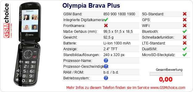 Hast du eigene Webseite? Willst du die Informationen über Standarddaten des Handys Olympia Brava Plus irgendwo veröffentlichen? Das ist sehr einfach. Du kannst das Bild herunterladen oder kopieren und auf der Webseite folgenden Code hinzufügen:Das Einfügen von diesem Code verursacht das Anzeigen von dem folgenden Bild: