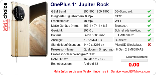 Daten des Mobiltelefons OnePlus 11 Jupiter Rock auf Ihrer Seite
