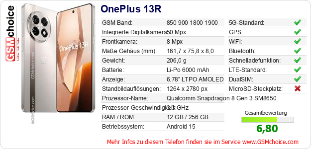 Hast du eigene Webseite? Willst du die Informationen über Standarddaten des Handys OnePlus 13R irgendwo veröffentlichen? Das ist sehr einfach. Du kannst das Bild herunterladen oder kopieren und auf der Webseite folgenden Code hinzufügen:Das Einfügen von diesem Code verursacht das Anzeigen von dem folgenden Bild: