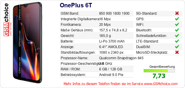 Hast du eigene Webseite? Willst du die Informationen über Standarddaten des Handys OnePlus 6T irgendwo veröffentlichen? Das ist sehr einfach. Du kannst das Bild herunterladen oder kopieren und auf der Webseite folgenden Code hinzufügen:Das Einfügen von diesem Code verursacht das Anzeigen von dem folgenden Bild: