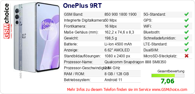 Hast du eigene Webseite? Willst du die Informationen über Standarddaten des Handys OnePlus 9RT irgendwo veröffentlichen? Das ist sehr einfach. Du kannst das Bild herunterladen oder kopieren und auf der Webseite folgenden Code hinzufügen:Das Einfügen von diesem Code verursacht das Anzeigen von dem folgenden Bild: