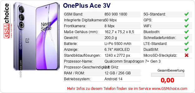 Hast du eigene Webseite? Willst du die Informationen über Standarddaten des Handys OnePlus Ace 3V irgendwo veröffentlichen? Das ist sehr einfach. Du kannst das Bild herunterladen oder kopieren und auf der Webseite folgenden Code hinzufügen:Das Einfügen von diesem Code verursacht das Anzeigen von dem folgenden Bild: