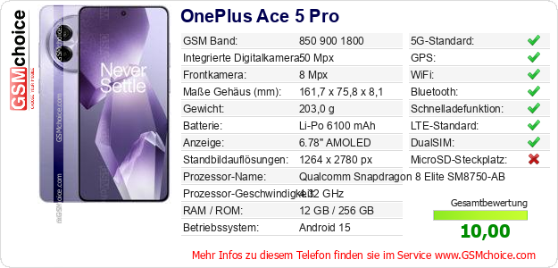 Daten des Mobiltelefons OnePlus Ace 5 Pro auf Ihrer Seite