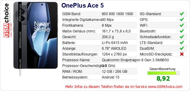 Hast du eigene Webseite? Willst du die Informationen über Standarddaten des Handys OnePlus Ace 5 irgendwo veröffentlichen? Das ist sehr einfach. Du kannst das Bild herunterladen oder kopieren und auf der Webseite folgenden Code hinzufügen:Das Einfügen von diesem Code verursacht das Anzeigen von dem folgenden Bild: