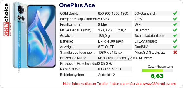 Hast du eigene Webseite? Willst du die Informationen über Standarddaten des Handys OnePlus Ace irgendwo veröffentlichen? Das ist sehr einfach. Du kannst das Bild herunterladen oder kopieren und auf der Webseite folgenden Code hinzufügen:Das Einfügen von diesem Code verursacht das Anzeigen von dem folgenden Bild: