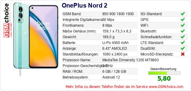 Hast du eigene Webseite? Willst du die Informationen über Standarddaten des Handys OnePlus Nord 2 irgendwo veröffentlichen? Das ist sehr einfach. Du kannst das Bild herunterladen oder kopieren und auf der Webseite folgenden Code hinzufügen:Das Einfügen von diesem Code verursacht das Anzeigen von dem folgenden Bild: