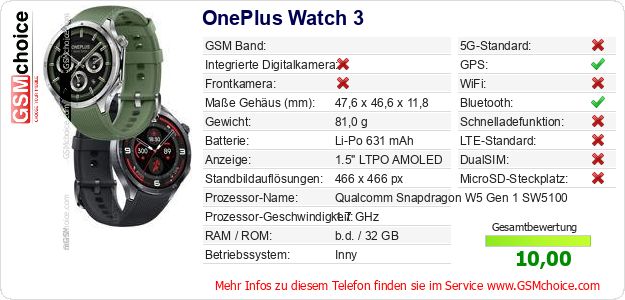 Hast du eigene Webseite? Willst du die Informationen über Standarddaten des Handys OnePlus Watch 3 irgendwo veröffentlichen? Das ist sehr einfach. Du kannst das Bild herunterladen oder kopieren und auf der Webseite folgenden Code hinzufügen:Das Einfügen von diesem Code verursacht das Anzeigen von dem folgenden Bild: