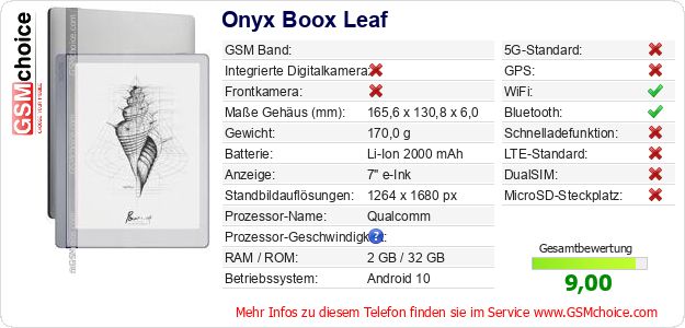 Hast du eigene Webseite? Willst du die Informationen über Standarddaten des Handys Onyx Boox Leaf irgendwo veröffentlichen? Das ist sehr einfach. Du kannst das Bild herunterladen oder kopieren und auf der Webseite folgenden Code hinzufügen:Das Einfügen von diesem Code verursacht das Anzeigen von dem folgenden Bild:
