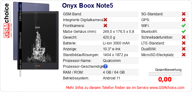 Hast du eigene Webseite? Willst du die Informationen über Standarddaten des Handys Onyx Boox Note5 irgendwo veröffentlichen? Das ist sehr einfach. Du kannst das Bild herunterladen oder kopieren und auf der Webseite folgenden Code hinzufügen:Das Einfügen von diesem Code verursacht das Anzeigen von dem folgenden Bild: