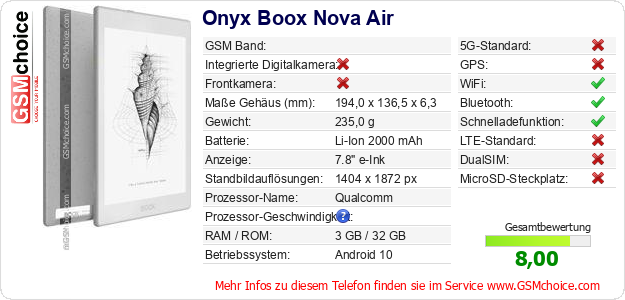 Hast du eigene Webseite? Willst du die Informationen über Standarddaten des Handys Onyx Boox Nova Air irgendwo veröffentlichen? Das ist sehr einfach. Du kannst das Bild herunterladen oder kopieren und auf der Webseite folgenden Code hinzufügen:Das Einfügen von diesem Code verursacht das Anzeigen von dem folgenden Bild: