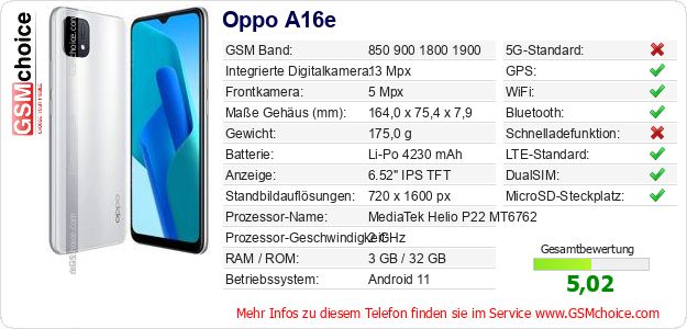 Hast du eigene Webseite? Willst du die Informationen über Standarddaten des Handys Oppo A16e irgendwo veröffentlichen? Das ist sehr einfach. Du kannst das Bild herunterladen oder kopieren und auf der Webseite folgenden Code hinzufügen:Das Einfügen von diesem Code verursacht das Anzeigen von dem folgenden Bild: