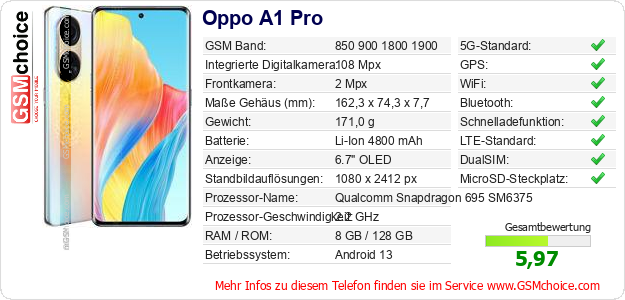 Hast du eigene Webseite? Willst du die Informationen über Standarddaten des Handys Oppo A1 Pro irgendwo veröffentlichen? Das ist sehr einfach. Du kannst das Bild herunterladen oder kopieren und auf der Webseite folgenden Code hinzufügen:Das Einfügen von diesem Code verursacht das Anzeigen von dem folgenden Bild: