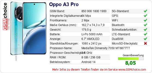 Hast du eigene Webseite? Willst du die Informationen über Standarddaten des Handys Oppo A3 Pro irgendwo veröffentlichen? Das ist sehr einfach. Du kannst das Bild herunterladen oder kopieren und auf der Webseite folgenden Code hinzufügen:Das Einfügen von diesem Code verursacht das Anzeigen von dem folgenden Bild: