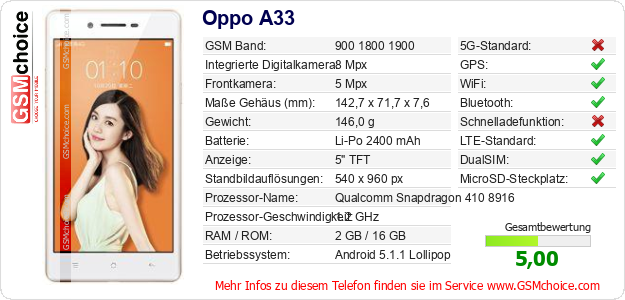 Hast du eigene Webseite? Willst du die Informationen über Standarddaten des Handys Oppo A33 irgendwo veröffentlichen? Das ist sehr einfach. Du kannst das Bild herunterladen oder kopieren und auf der Webseite folgenden Code hinzufügen:Das Einfügen von diesem Code verursacht das Anzeigen von dem folgenden Bild: