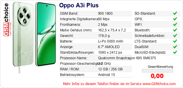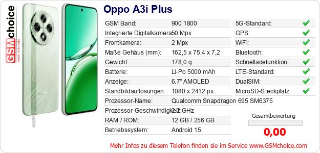 Hast du eigene Webseite? Willst du die Informationen über Standarddaten des Handys Oppo A3i Plus irgendwo veröffentlichen? Das ist sehr einfach. Du kannst das Bild herunterladen oder kopieren und auf der Webseite folgenden Code hinzufügen:Das Einfügen von diesem Code verursacht das Anzeigen von dem folgenden Bild: