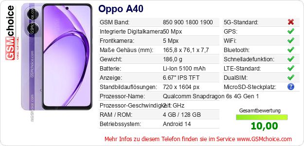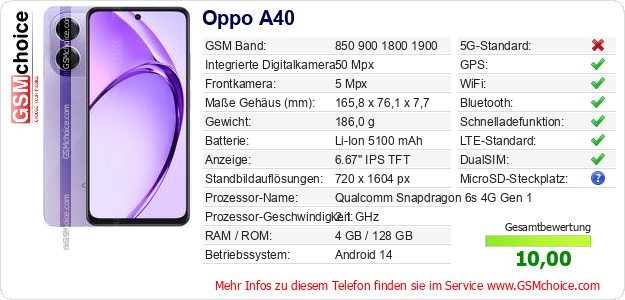 Hast du eigene Webseite? Willst du die Informationen über Standarddaten des Handys Oppo A40 irgendwo veröffentlichen? Das ist sehr einfach. Du kannst das Bild herunterladen oder kopieren und auf der Webseite folgenden Code hinzufügen:Das Einfügen von diesem Code verursacht das Anzeigen von dem folgenden Bild: