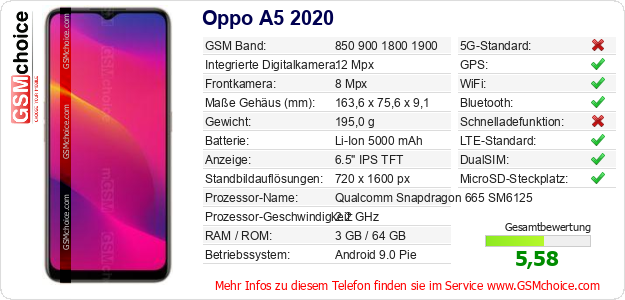 Hast du eigene Webseite? Willst du die Informationen über Standarddaten des Handys Oppo A5 2020 irgendwo veröffentlichen? Das ist sehr einfach. Du kannst das Bild herunterladen oder kopieren und auf der Webseite folgenden Code hinzufügen:Das Einfügen von diesem Code verursacht das Anzeigen von dem folgenden Bild: