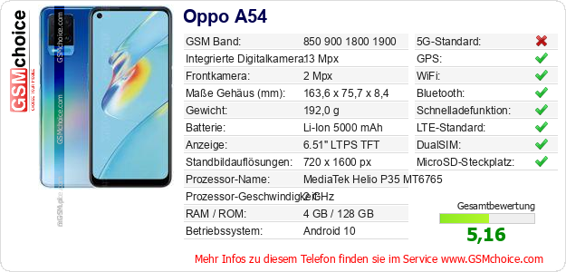 Hast du eigene Webseite? Willst du die Informationen über Standarddaten des Handys Oppo A54 irgendwo veröffentlichen? Das ist sehr einfach. Du kannst das Bild herunterladen oder kopieren und auf der Webseite folgenden Code hinzufügen:Das Einfügen von diesem Code verursacht das Anzeigen von dem folgenden Bild: