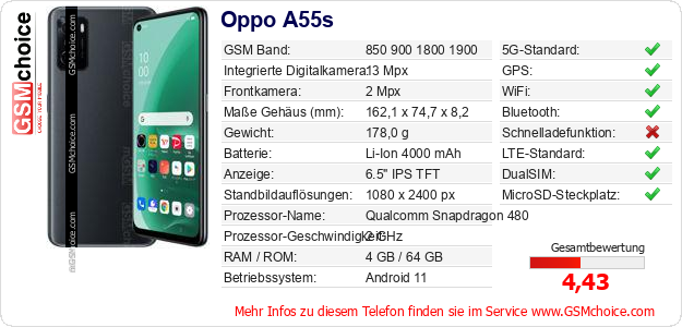 Hast du eigene Webseite? Willst du die Informationen über Standarddaten des Handys Oppo A55s irgendwo veröffentlichen? Das ist sehr einfach. Du kannst das Bild herunterladen oder kopieren und auf der Webseite folgenden Code hinzufügen:Das Einfügen von diesem Code verursacht das Anzeigen von dem folgenden Bild: