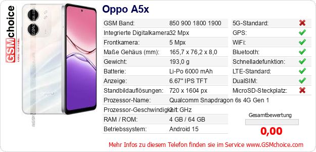 Hast du eigene Webseite? Willst du die Informationen über Standarddaten des Handys Oppo A5x irgendwo veröffentlichen? Das ist sehr einfach. Du kannst das Bild herunterladen oder kopieren und auf der Webseite folgenden Code hinzufügen:Das Einfügen von diesem Code verursacht das Anzeigen von dem folgenden Bild: