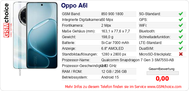 Hast du eigene Webseite? Willst du die Informationen über Standarddaten des Handys Oppo A6l irgendwo veröffentlichen? Das ist sehr einfach. Du kannst das Bild herunterladen oder kopieren und auf der Webseite folgenden Code hinzufügen:Das Einfügen von diesem Code verursacht das Anzeigen von dem folgenden Bild: