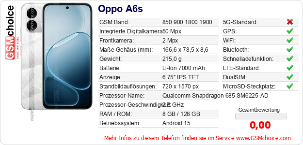 Hast du eigene Webseite? Willst du die Informationen über Standarddaten des Handys Oppo A6s irgendwo veröffentlichen? Das ist sehr einfach. Du kannst das Bild herunterladen oder kopieren und auf der Webseite folgenden Code hinzufügen:Das Einfügen von diesem Code verursacht das Anzeigen von dem folgenden Bild: