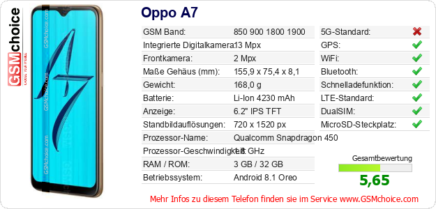Hast du eigene Webseite? Willst du die Informationen über Standarddaten des Handys Oppo A7 irgendwo veröffentlichen? Das ist sehr einfach. Du kannst das Bild herunterladen oder kopieren und auf der Webseite folgenden Code hinzufügen:Das Einfügen von diesem Code verursacht das Anzeigen von dem folgenden Bild: