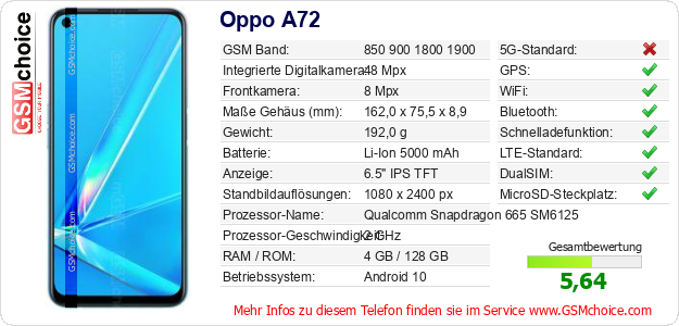 Hast du eigene Webseite? Willst du die Informationen über Standarddaten des Handys Oppo A72 irgendwo veröffentlichen? Das ist sehr einfach. Du kannst das Bild herunterladen oder kopieren und auf der Webseite folgenden Code hinzufügen:Das Einfügen von diesem Code verursacht das Anzeigen von dem folgenden Bild: