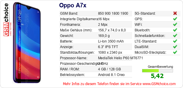 Hast du eigene Webseite? Willst du die Informationen über Standarddaten des Handys Oppo A7x irgendwo veröffentlichen? Das ist sehr einfach. Du kannst das Bild herunterladen oder kopieren und auf der Webseite folgenden Code hinzufügen:Das Einfügen von diesem Code verursacht das Anzeigen von dem folgenden Bild: