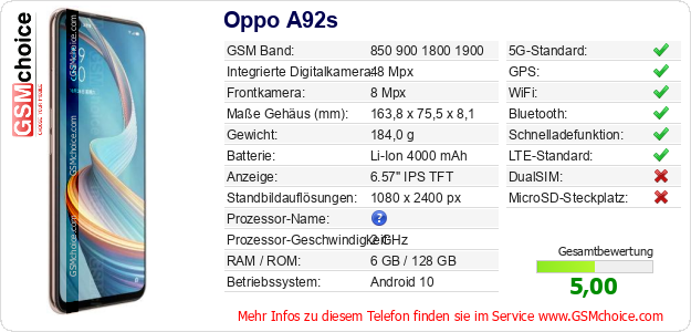 Hast du eigene Webseite? Willst du die Informationen über Standarddaten des Handys Oppo A92s irgendwo veröffentlichen? Das ist sehr einfach. Du kannst das Bild herunterladen oder kopieren und auf der Webseite folgenden Code hinzufügen:Das Einfügen von diesem Code verursacht das Anzeigen von dem folgenden Bild:
