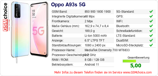 Hast du eigene Webseite? Willst du die Informationen über Standarddaten des Handys Oppo A93s 5G irgendwo veröffentlichen? Das ist sehr einfach. Du kannst das Bild herunterladen oder kopieren und auf der Webseite folgenden Code hinzufügen:Das Einfügen von diesem Code verursacht das Anzeigen von dem folgenden Bild: