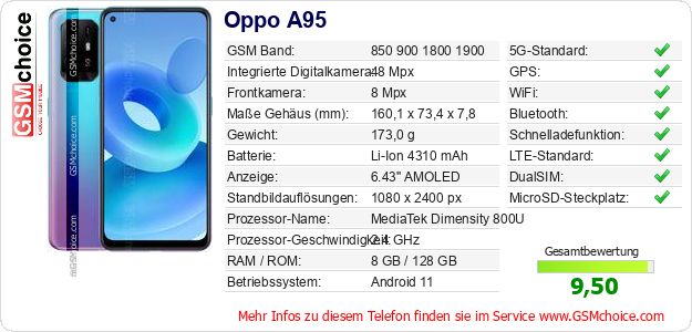 Hast du eigene Webseite? Willst du die Informationen über Standarddaten des Handys Oppo A95 irgendwo veröffentlichen? Das ist sehr einfach. Du kannst das Bild herunterladen oder kopieren und auf der Webseite folgenden Code hinzufügen:Das Einfügen von diesem Code verursacht das Anzeigen von dem folgenden Bild: