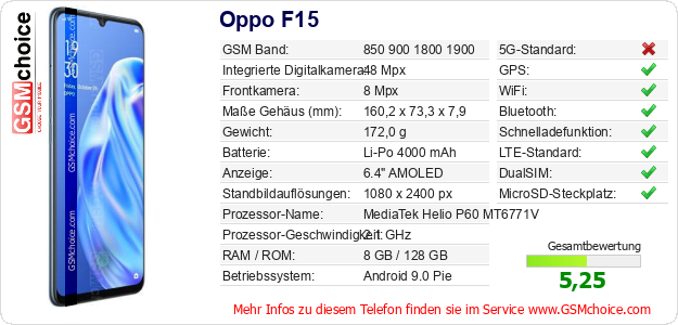 Hast du eigene Webseite? Willst du die Informationen über Standarddaten des Handys Oppo F15 irgendwo veröffentlichen? Das ist sehr einfach. Du kannst das Bild herunterladen oder kopieren und auf der Webseite folgenden Code hinzufügen:Das Einfügen von diesem Code verursacht das Anzeigen von dem folgenden Bild: