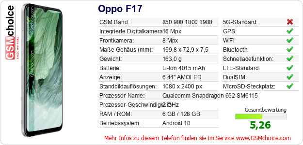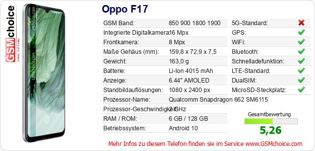 Hast du eigene Webseite? Willst du die Informationen über Standarddaten des Handys Oppo F17 irgendwo veröffentlichen? Das ist sehr einfach. Du kannst das Bild herunterladen oder kopieren und auf der Webseite folgenden Code hinzufügen:Das Einfügen von diesem Code verursacht das Anzeigen von dem folgenden Bild: