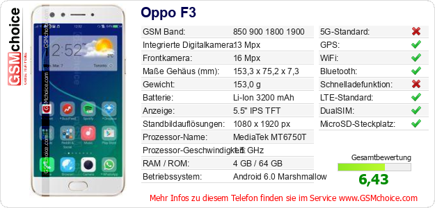 Hast du eigene Webseite? Willst du die Informationen über Standarddaten des Handys Oppo F3 irgendwo veröffentlichen? Das ist sehr einfach. Du kannst das Bild herunterladen oder kopieren und auf der Webseite folgenden Code hinzufügen:Das Einfügen von diesem Code verursacht das Anzeigen von dem folgenden Bild: