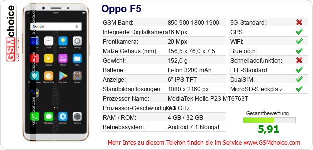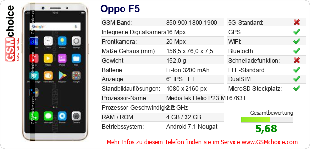 Hast du eigene Webseite? Willst du die Informationen über Standarddaten des Handys Oppo F5 irgendwo veröffentlichen? Das ist sehr einfach. Du kannst das Bild herunterladen oder kopieren und auf der Webseite folgenden Code hinzufügen:Das Einfügen von diesem Code verursacht das Anzeigen von dem folgenden Bild: