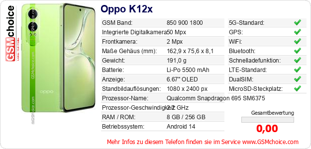 Hast du eigene Webseite? Willst du die Informationen über Standarddaten des Handys Oppo K12x irgendwo veröffentlichen? Das ist sehr einfach. Du kannst das Bild herunterladen oder kopieren und auf der Webseite folgenden Code hinzufügen:Das Einfügen von diesem Code verursacht das Anzeigen von dem folgenden Bild: